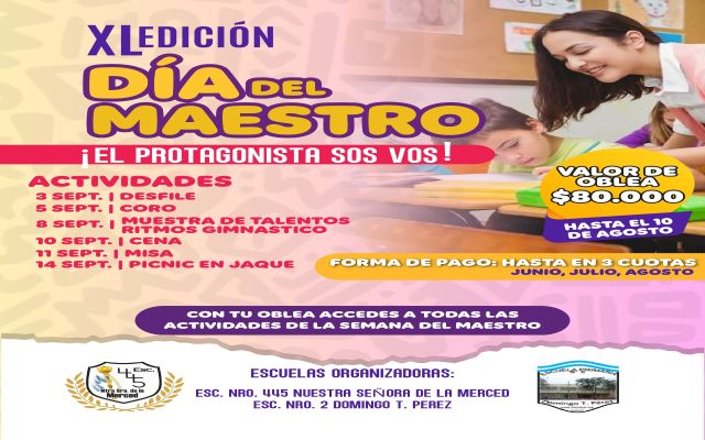 Por otra parte, destacó, “nosotros convocamos a todos los docentes de la provincia de Jujuy, no solamente a los de San Pedro para que puedan participar en esta fiesta tan importante, además pueden venir con su escuela, participar del evento, tanto el encuentro coral, como del desfile, como todos los eventos que tenemos, así que nosotros vamos a estar con la venta de obleas que tienen un precio de 80.000 pesos la cual abarca todos los eventos, no solamente la fiesta, sino que va a tener el acceso a todos los eventos que tiene esta semana del maestro”.