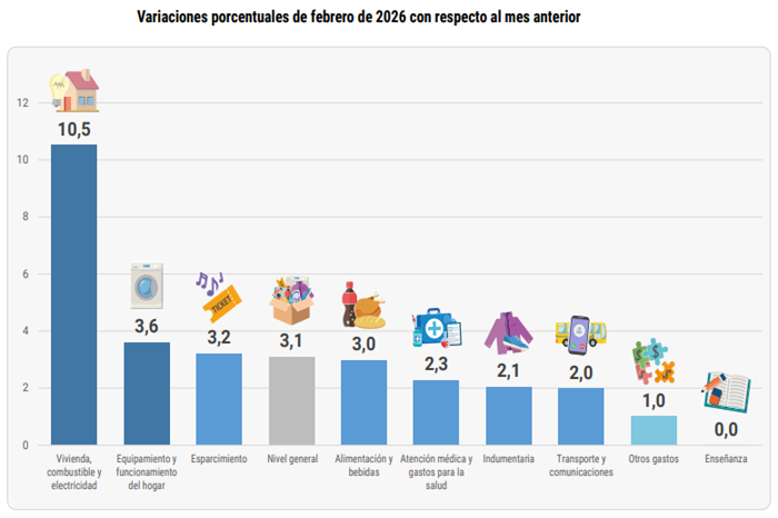 En cuanto a los rubros que lo componen, los que tuvieron mayor suba en febrero fueron Vivienda, combustible y electricidad con el 10.5%, antes Equipamiento y funcionamiento del hogar con el 3.6%, y también Esparcimiento con 3.2%.