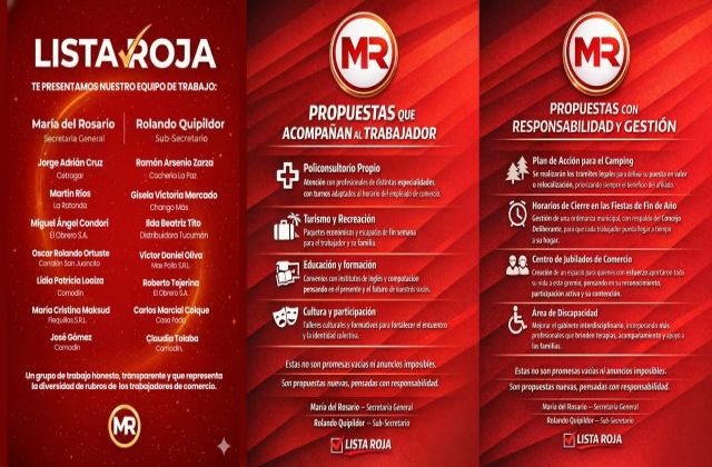 Asimismo, destacó el contacto permanente con los empleados mercantiles y sus familias, remarcando que la lista Roja mantiene una presencia activa en los lugares de trabajo y en el ámbito sindical.