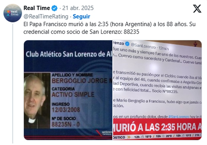 El Papa Francisco murió este lunes a las 7:35 hora de Italia. Así lo anunciaron desde el Vaticano. pero una coincidencia con el horario de su deceso en argentina y el club de sus amores, San Lorenzo, está inundando las redes sociales. Se trata de esas cuestiones divinas o míticas que son de creer o reventar.