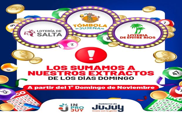 El Instituto Provincial de Juegos de Azar de Jujuy (INPROJUY) informa que a partir del domingo 2 de noviembre de 2025, el extracto de Tómbola de Entre Ríos se incorpora al sistema de sorteos que se realizan en la provincia, utilizando el mismo mecanismo implementado actualmente con la Lotería de Salta.