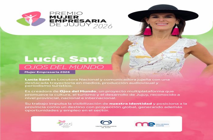 Lucía Sant es Locutora Nacional y comunicadora jujeña, creadora de Ojos del Mundo, un proyecto multiplataforma que promueve la cultura, el turismo y el desarrollo de la provincia, con reconocimiento a nivel provincial, nacional e internacional. Su trabajo impulsa la visibilización de la identidad local y posiciona a Jujuy como un destino con proyección global, generando además oportunidades y empleo en el sector.