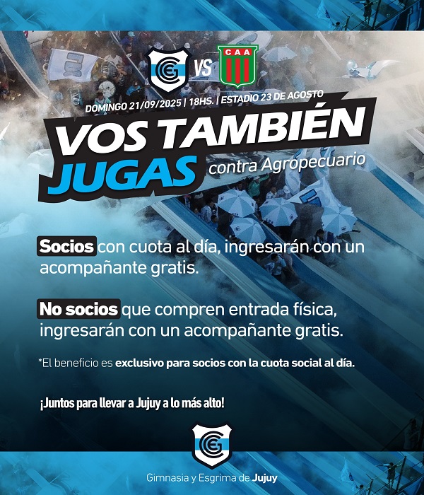 De cara al partido que disputarán Gimnasia y Esgrima de Jujuy y Agropecuario Argentino el próximo domingo, a horas 18, en el “23 de Agosto”, la dirigencia albiceleste lanza promociones para que los hinchas colmen el estadio y desde las tribunas sean un jugador más.