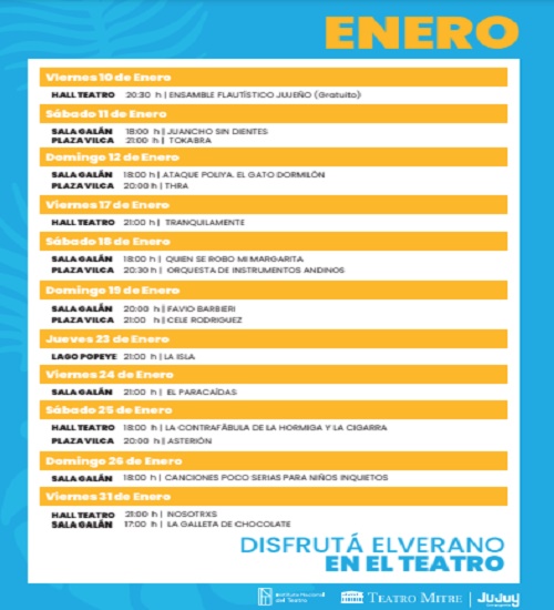 Este ciclo es resultado de un plan de articulación entre el Teatro Mitre el Instituto Nacional de Teatro representación Jujuy (INT), con el objetivo de revitalizar la escena artística local brindar a la comunidad jujeña y turistas una oferta cultural diversa durante la temporada estival.