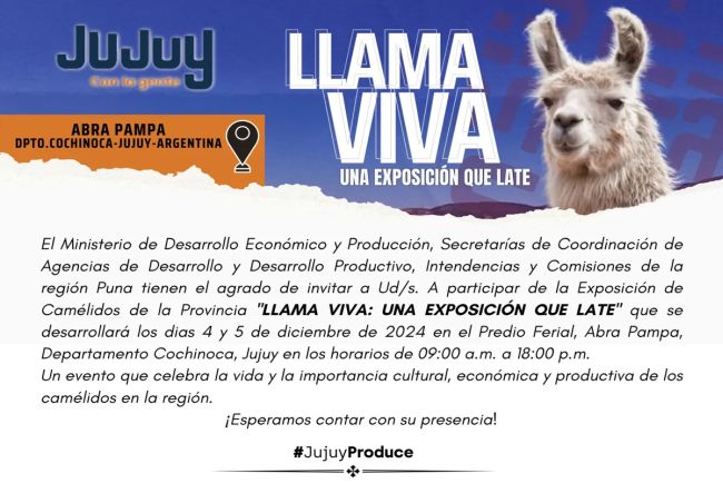 El 4 y 5 de diciembre, el gobierno de la Provincia, a través del ministerio de Desarrollo Económico y Producción, y junto a las comisiones municipales y municipios de la Puna, realizará en Abra Pampa la exposición «Llama Viva: una exposición que late», evento que busca promover prácticas sostenibles, aumentando la calidad de las crías y fortaleciendo el desarrollo de los criadores locales.