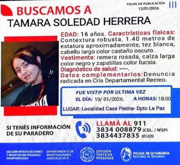 La adolescente faltaba de su hogar en la localidad catamarqueña de Casa de Piedra desde el pasado sábado 10 de enero, lo que había activado un pedido de colaboración interprovincial de la División Trata de Personas (D-5).
