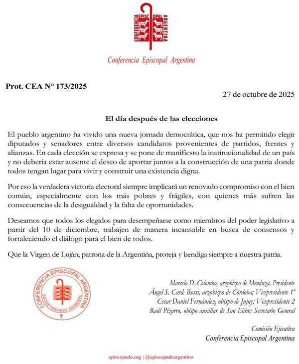En un mensaje difundido tras las elecciones, la Comisión Ejecutiva de la Conferencia Episcopal Argentina (CEA) destacó que cada proceso electoral reafirma la institucionalidad del país y debe ser ocasión para fortalecer la construcción de una patria donde todos tengan un lugar digno para vivir.