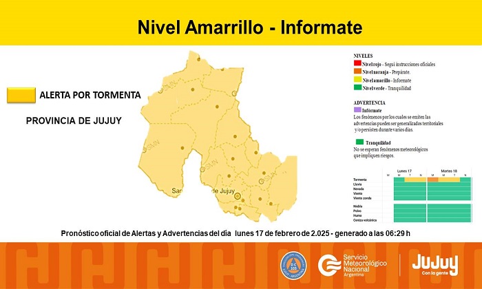 Según el SMN, en zonas con alerta amarilla, “el área será afectada por tormentas, algunas localmente fuertes. Las mismas estarán acompañadas por abundante caída de agua en cortos períodos, actividad eléctrica, ocasional caída de granizo y ráfagas que podrían estar entre los 60 y 80 km/h».