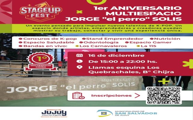 Con shows en vivo de Los Carnavaleros y La 115 como principales atracciones, la Municipalidad de San Salvador de Jujuy celebrará el primer aniversario del multiespacio “Jorge ‘El Perro’ Solís” del barrio Chijra con el StageUp Fest, un evento que también incluirá concurso de K-POP, stands de emprendedores, espacios saludables y propuestas recreativas para toda la comunidad. La propuesta tendrá lugar el lunes 16 de diciembre, de 15 a 22 horas, en Llamas esquina Los Quebrachales.