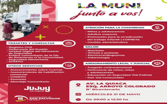 La Municipalidad de San Salvador de Jujuy invita a los vecinos del barrio Bicentenario de Alto Comedero y zonas cercanas a participar de una nueva edición del operativo “La Muni junto a vos”, una jornada pensada para acercar trámites, asesoramiento y servicios esenciales a la comunidad.