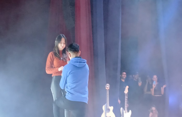 Hubo también espacio para la sorpresa, para lo inesperado, para esos instantes que sólo el arte en vivo sabe provocar. Promediando la noche, una pareja joven —ganadores de un sorteo radial— vivió un momento que quedará en sus biografías personales como una escena luminosa. El muchacho, nervioso pero decidido, tomó el micrófono y, ante el asombro de todos, se arrodilló. La propuesta de casamiento se volvió un suspiro colectivo. El “sí” emocionado de la joven, el aplauso eufórico del público y la sonrisa cómplice de Morelo —convertida, sin quererlo, en una suerte de Roberto Galán moderna— hicieron del Centro Cultural Martín Fierro un teatro del amor.