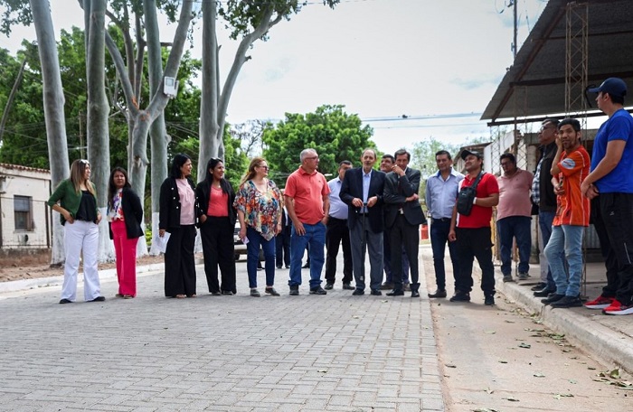 El mandatario provincial, acompañado por el intendente David Abraham Paoli, verificó el progreso de la obra de adoquinado de la calle Sarmiento, etapa que proyecta futuras ampliaciones sobre la misma arteria.