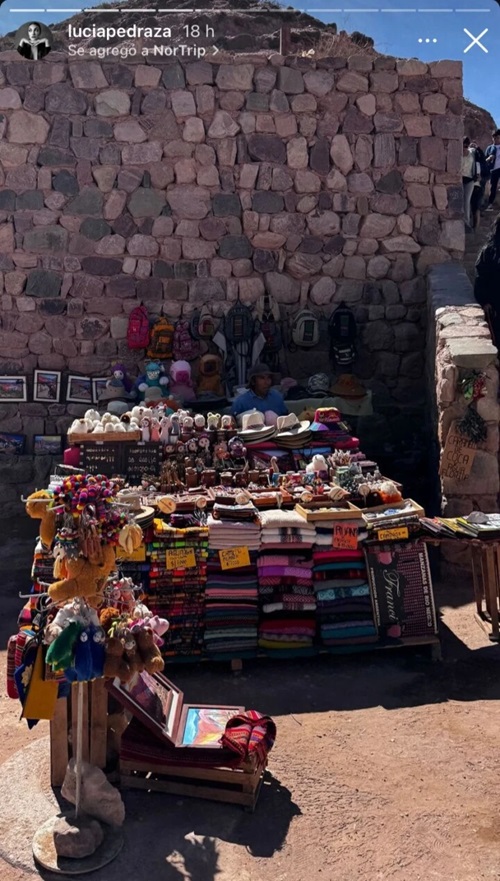 En tantas imágenes de paisajes soñados, Lucía Pedraza también compartió una postal de los típicos puestitos callejeros. Ahí se pueden ver los textiles clásicos de la zona con sus característicos colores y diseños milenarios.