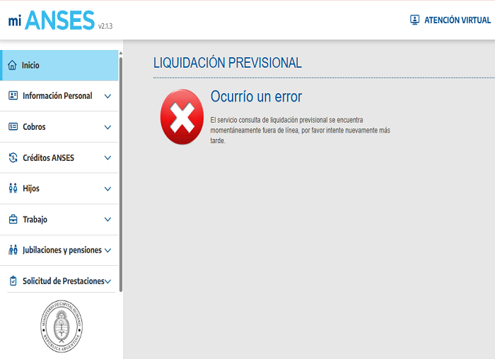 Y este martes 11 cuando ingresan a la página y van a querer saber o conocer sobre sus recibos, directamente aparece la leyenda “Ocurrió un error”. Por lo que de esta manera siguen sin esa información importante y tampoco se conoce algún comunicado de ANSES de lo que está sucediendo con esta página y en especial con los recibos de liquidación.