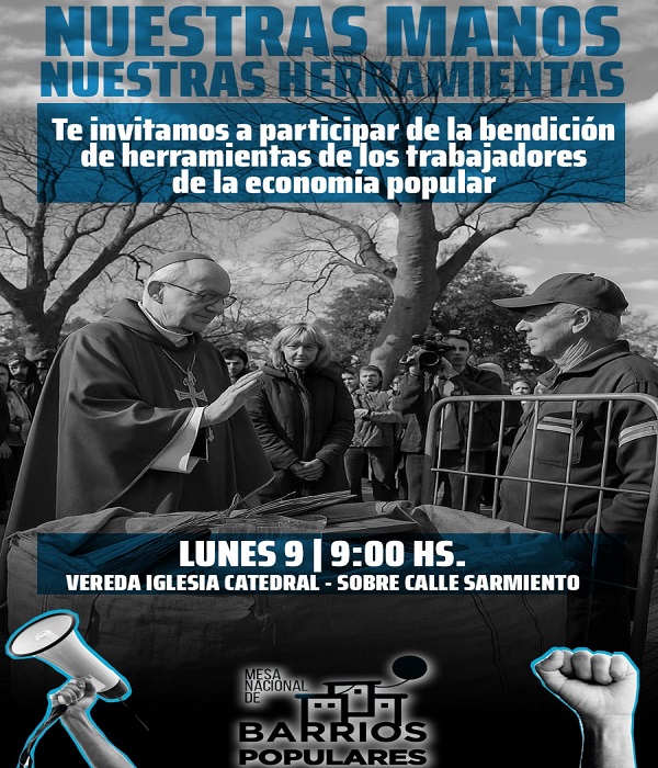 Desde la Mesa Nacional de Barrios Populares invitan a participar de la bendición de herramientas de los Trabajadores de la Economía Popular. La misma estará a cargo del obispo de la provincia Monseñor César Daniel Fernández.