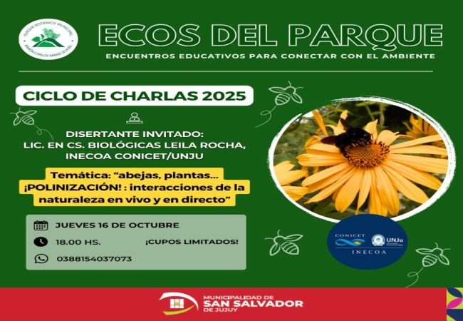 El Parque Botánico Municipal “Barón Carlos María Schuel”, invita a la comunidad a participar de una nueva edición del ciclo Ecos del Parque, bajo la temática “Abejas, plantas… ¡Polinización!: interacciones de la naturaleza en vivo y en directo”, que se llevará a cabo el jueves 16 de octubre a las 18 horas.
