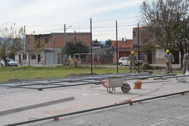 En el polideportivo del barrio 16 de Mayo, lindante al barrio Malvinas, la DPA inspecciona a los equipos de trabajo — integrados por cooperativistas— que construyeron nuevas tribunas y construyen una nueva carpeta de piso, avanzan en el armado de paños tejidos con mallas metálicas para la instalación de la futura nueva jaula del polideportivo, y, próximamente, colocarán nuevos reflectores y pintura de alto tránsito en la cancha.