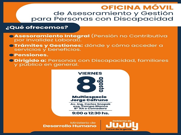 El Ministerio de Desarrollo Humano de Jujuy, a través de la Secretaría de Desarrollo Integral y la Dirección Provincial de Inclusión de Personas con Discapacidad, informa que este viernes 8 de agosto se desarrollará una nueva jornada de atención territorial mediante la Oficina Móvil de Asesoramiento y Gestión para Personas con Discapacidad.