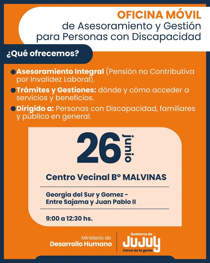 El Ministerio de Desarrollo Humano, a través de la Secretaría de Desarrollo Integral y la Dirección Provincial de Inclusión de Personas con Discapacidad, brindará atención en la Oficina Móvil de Gestión y Asesoramiento en barrio Malvinas de la capital jujeña, acercando información, orientación y acompañamiento a personas con discapacidad, sus familias y toda persona interesada.