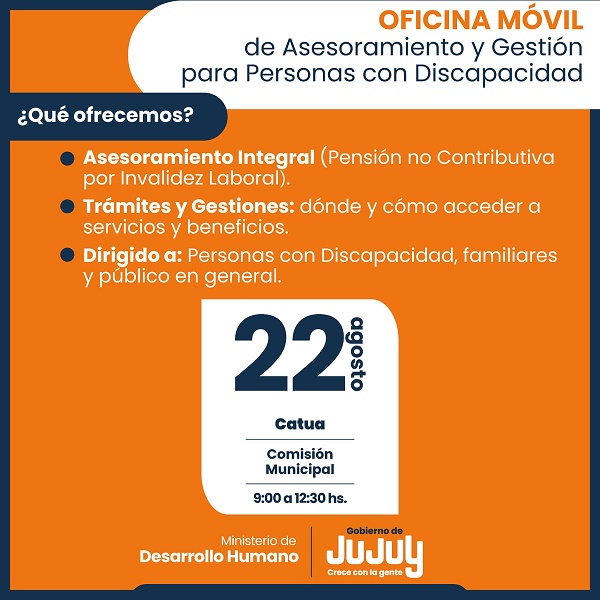 El Ministerio de Desarrollo Humano de la Provincia de Jujuy, a través de la Secretaría de Desarrollo Integral y la Dirección Provincial de Inclusión de Personas con Discapacidad, informa que el próximo viernes 22 de agosto se instalará la Oficina Móvil de Asesoramiento y Gestión para Personas con Discapacidad en la localidad de Catua, en la sede de la Comisión Municipal en el horario de 9 a 12:30 horas.
