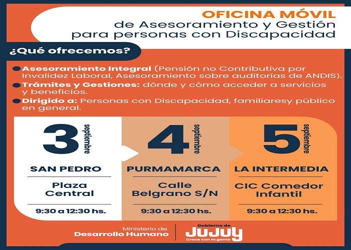 El Ministerio de Desarrollo Humano de Jujuy, a través de la Secretaría de Desarrollo Integral y la Dirección Provincial de Inclusión de Personas con Discapacidad informa que durante la próxima semana la Oficina Móvil de Gestión y Asesoramiento recorrerá distintas localidades de la provincia, con el objetivo de acercar información, asesoramiento y acompañamiento a personas con discapacidad y sus familias.