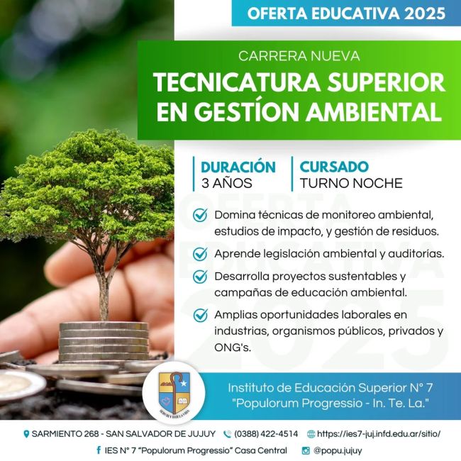 Las inscripciones para la Tecnicatura Superior en Gestión Ambiental cierran el próximo viernes 14 de marzo, y las personas interesadas puedan acceder a más información en https://ies7-juj.infd.edu.ar/sitio/