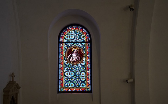 La construcción del templo es de 1944 y, entre otros acervos, tiene nueve vitrales realizados por un famoso artista español.