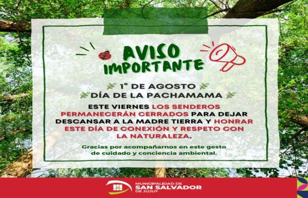 En el marco del Día de la Pachamama, el próximo viernes 1° de agosto los senderos del Parque Botánico Municipal permanecerán cerrados durante toda la jornada.