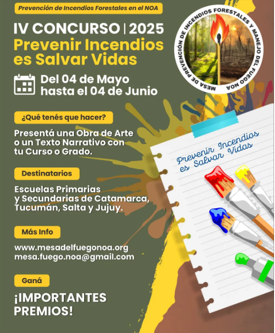 Luego de una exitosa 3º edición de este concurso en 2024, donde más de 40 escuelas de Jujuy participaron, se dio inició al 4º concurso para motivar a los participantes a tomar una acción proactiva frente a la problemática del fuego y la amenaza de los incendios forestales. A través de la campaña de prevención, se busca que niños y jóvenes se conviertan en promotores ambientales y lleven este mensaje a sus familias, amigos y puedan crear, al mismo tiempo, su propia consciencia ambiental. Por eso, el IV Concurso 2025: “Prevenir incendios es salvar vidas” convoca a las escuelas y sus docentes, a motivar a los niños y jóvenes a trabajar en forma grupal para la presentación de expresiones artísticas – cuadros artísticos y textos narrativos – los cuales luego serán expuestos en cada provincia.