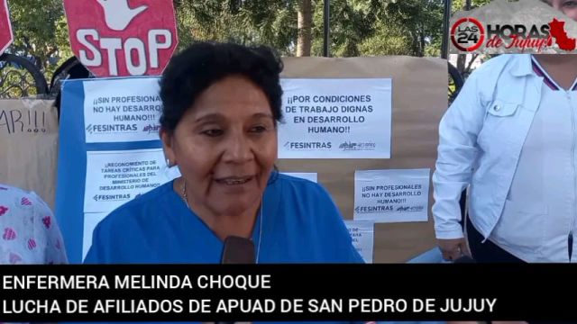 La enfermera Melinda Choque comentó, “somos profesionales de la Dirección de Niñez que pertenecemos al Ministerio de Desarrollo Humano de la provincia, estamos aquí porque pidiendo mejores condiciones de trabajo, que se nos pague criticidad y también el reconocimiento para los profesionales de la línea 102 que intervienen en toda la provincia”.