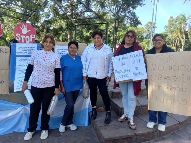 Luego comentó, “porque hace 17 años que este Ministerio ha creado la Dirección de Niñez y nosotros al momento no tenemos el reconocimiento de criticidad cuando trabajamos con niños y sus familias en situaciones de extrema vulnerabilidad y hace 8 meses que se hizo una presentación desde el gremio de APUAP a la ministra de Desarrollo Humano y a la fecha no tenemos respuesta. La semana pasada el día 26, estuvimos en una asamblea donde justamente el gremio convoca hoy a esta manifestación pacífica por supuesto para que demos a conocer tanto los del interior como los de Capital lo que realmente viven los profesionales de Desarrollo Humano, por eso dicen nuestros carteles ¡sin profesionales no hay Ministerio de Desarrollo Humano!”.