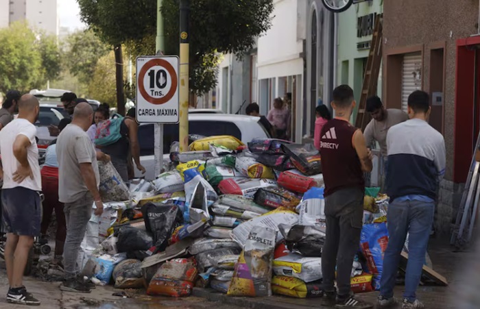 Su vereda y casi todas son, desde las primeras horas de este sábado, una suerte de mercado o feria de saldos a cielo abierto, de esquina a esquina. Muebles, mercadería, cajas con documentación, libros…. Todo se amontona junto al cordón para sacar barro acumulado. Un comercio de venta de alimentos para perros llena la esquina con más de 100 bolsas de 15 a 20 kilos cada uno, todo descarte. “Al que le sirve, que se las lleve, porque no se pueden vender”, avisan y pronto hay cola para cargar y arrasar con esos paquetes.