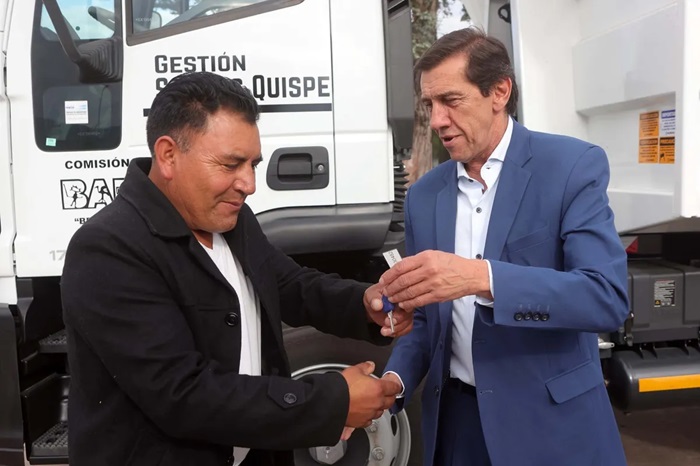 El gobernador de la Provincia, Carlos Sadir, encabezó el acto de entrega de dos camiones volquetes, para las comisiones municipales de Cangrejillos y de Barrios, adquiridos mediante recursos obtenidos de regalías mineras.