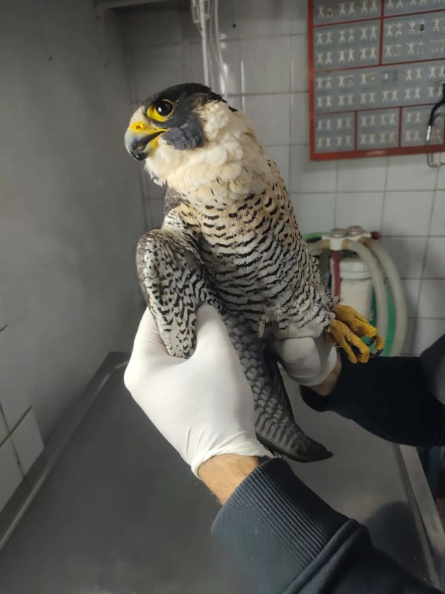 El halcón peregrino fue hallado en la vía pública con una fractura expuesta en el ala derecha y signos de sangrado, probablemente provocados por el impacto de un objeto contundente. El ave fue trasladada de inmediato al centro especializado.