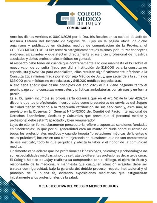 Ante los dichos vertidos el 08/01/2026 por la Dra. Iris Rosales en su calidad de Jefe de Asesoría Letrada del Instituto de Seguros de Jujuy en la página oficial de dicho organismo y publicados en distintos medios de comunicación de la Provincia, el COLEGIO MEDICO DE JUJUY rechaza categóricamente los mismos, por utilizar conceptos erróneos, agraviantes y que afectan directamente el ejercicio profesional de nuestros asociados y de los profesionales médicos en general. Al respecto cabe tener en cuenta que contrariamente a lo que manifiesta el ISJ sobre el nuevo valor de consulta fijado por dicha institución de $ 18.000 para la consulta no especialista y $ 28.000 para especialista, ellas resultan significativamente inferiores a la Consulta Ética mínima fijada por el Consejo Médico de Jujuy, que asciende a la suma de $ 35.000 para médicos no especialistas y $ 45.000 médicos especialistas.