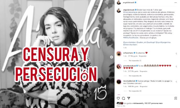 “Hoy después de todo este tiempo lo sigue haciendo, en este caso puntual censurando y dando de baja mis contenidos con argumentos insustentables”, escribió, junto a imágenes de notificaciones que le llegaron por violación de los derechos de autor de algunas de sus canciones, solicitadas por su expareja.