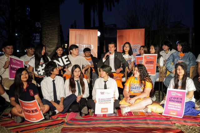 El gobernador de la Provincia, Carlos Sadir, estuvo presente en la Plaza España para el inicio de la campaña “No seas parte del daño”, generada por alumnos del nivel secundario, miembros de la Comisión Estudiantil de la FNE, para concientizar, sensibilizar y prevenir el bullying.