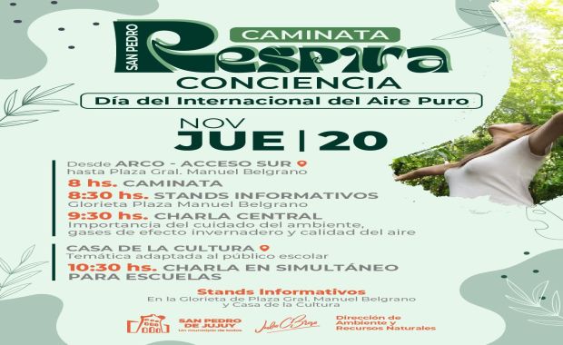 La Municipalidad de San Pedro de Jujuy, realizará este jueves la caminata por el Día Internacional del Aire Puro. El punto de concentración será en el arco del acceso sur a partir de las 8 y se invitó al público en general.
