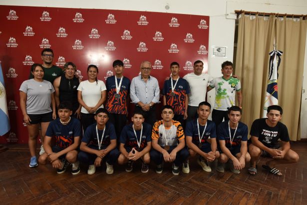 El intendente de San Pedro de Jujuy, Julio Bravo, junto al Subsecretario de Deportes José Luis Cabrera, la directora de Deportes Valeria Trujillo y el Coordinador del Deporte Adaptado Enzo Dorado, recibió y agasajó a los jóvenes deportistas que representaron a la ciudad y a la provincia en la Final Nacional de los Juegos Evita 2025, desarrollada en la ciudad de Mar del Plata.