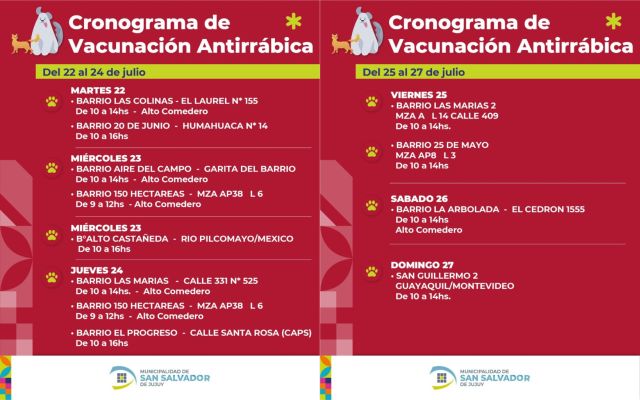 La Dirección de Zoonosis de la Municipalidad de San Salvador de Jujuy informó la incorporación de nuevos puntos de vacunación antirrábica gratuitos en distintos barrios, especialmente en la zona de Alto Comedero, que se suman al cronograma ya difundido días atrás.