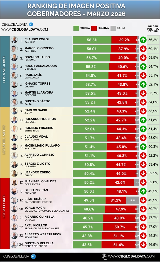 Los tres gobernadores mejor valorados de este mes por sus co-provincianos son Claudio Poggi (San Luis), quien encabeza el ranking con un 58,5% de imagen positiva; seguido por Marcelo Orrego (San Juan), con 58,0%; y en tercer lugar Osvaldo Jaldo (Tucumán), con 56,7% de aprobación.