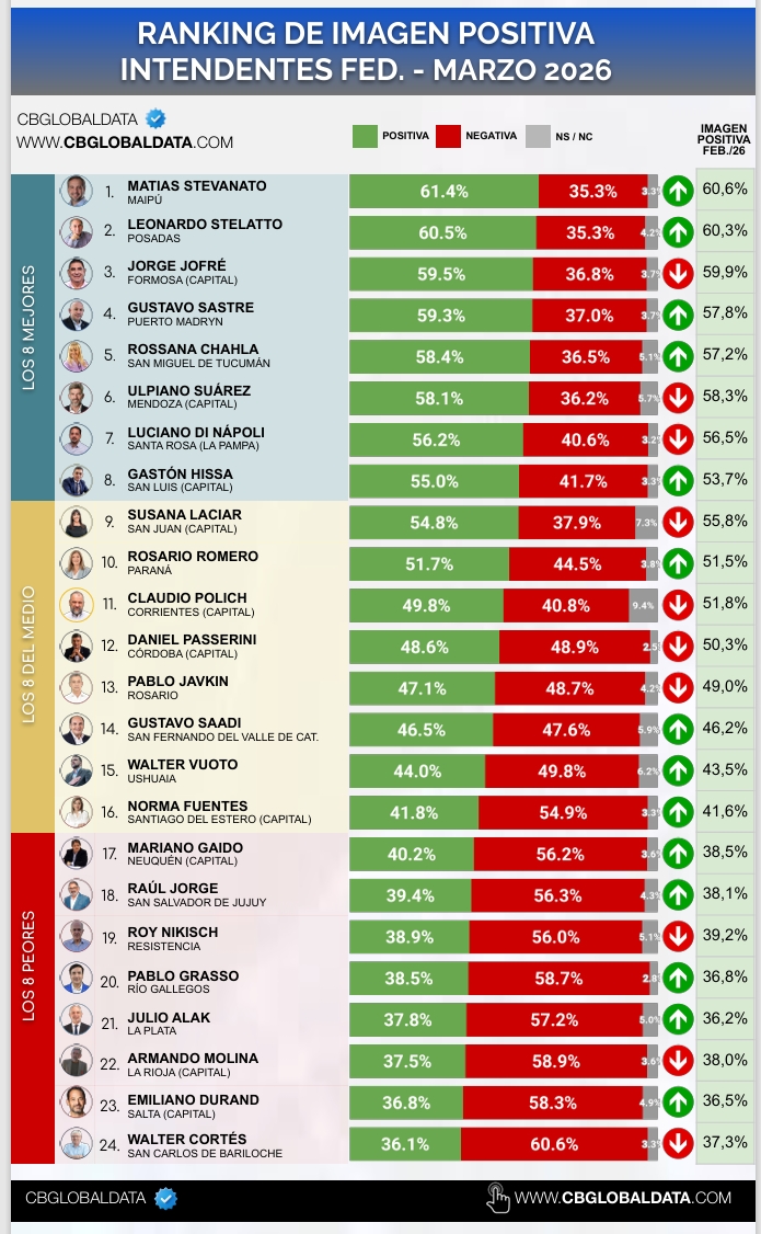 En el otro extremo del ranking, los intendentes peor calificados del mes de marzo de 2026 son Walter Cortés (Bariloche), quien se ubica en el último lugar con un 36,1% de imagen positiva; seguido por Emiliano Durand (Salta Capital), con 36,8%; y Armando Molina (La Rioja Capital), con 37,5% de aprobación.