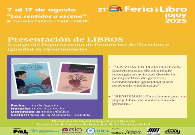 En el marco de una nueva edición de la Feria del Libro, la Municipalidad de San Salvador de Jujuy, a través del Departamento de Promoción de Derechos e Igualdad de Oportunidades de la Dirección de Salud Integral y de Género de la Secretaría de Desarrollo Humano invita a la comunidad a ser parte de dos encuentros que celebran la palabra, el arte y la construcción colectiva de sentidos en torno a la igualdad, la memoria y los derechos.