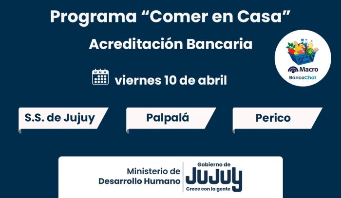 El Ministerio de Desarrollo Humano, mediante la Secretaría de Asistencia Directa, comunica que este viernes 10 de abril, se concretó la acreditación bancaria del programa “Comer en Casa”, destinada a los titulares de San Salvador de Jujuy, Palpalá y Perico.