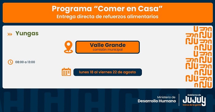 El Ministerio de Desarrollo Humano de Jujuy, mediante la Secretaría de Asistencia Directa, comunica que desde el lunes 18 de agosto, se llevará a cabo la entrega directa de módulos alimentarios del Programa “Comer en Casa”, a familias de las localidades de Pampichuela, Valle Grande y Caspalá.