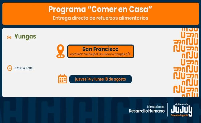 El Ministerio de Desarrollo Humano, de Jujuy mediante la Secretaría de Asistencia Directa, comunica que desde este jueves 14 de agosto, se llevará a cabo la entrega directa de módulos alimentarios del Programa “Comer en Casa”, a familias de las localidades de San Francisco, Santa Ana y Valle Colorado.