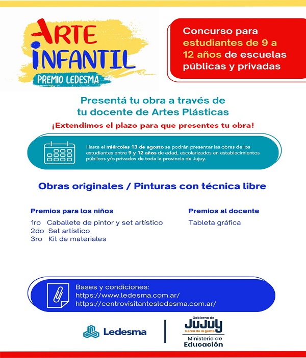 Hasta el miércoles 13 de agosto se podrán presentar las obras de los estudiantes entre 9 y 12 años de edad, escolarizados en establecimientos públicos y/o privados de toda la provincia de Jujuy, que deseen participar del concurso “Premio Ledesma de Arte Infantil” edición 2025.