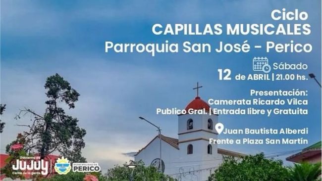 Este sábado 12 de abril a las 21.00 hs. se realizará en Perico el Ciclo Capillas Musicales, una propuesta de la Secretaría de Cultura de la Provincia, que pone en valor el patrimonio cultural a través de conciertos en espacios representativos de la ciudad.