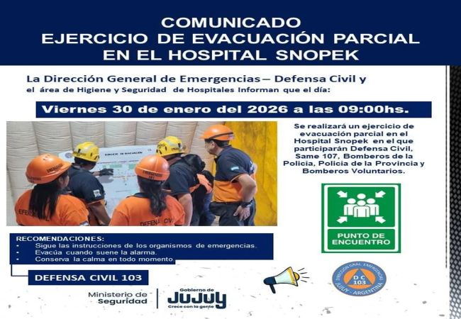 En el Hospital Carlos Snopek, ubicado en el barrio de Alto Comedero, se desarrollará un ejercicio de evacuación parcial en el sector de Archivo, donde cuatro personas, con previa capacitación, estarán involucradas como protagonistas en la jornada de simulacro.