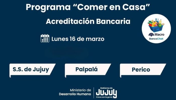 El Ministerio de Desarrollo Humano, a través de la Secretaría de Asistencia Directa, comunicó que hoy lunes 16 de marzo se efectuó la acreditación bancaria correspondiente al programa Comer en Casa, destinada a titulares de San Salvador de Jujuy, Palpalá y Perico.